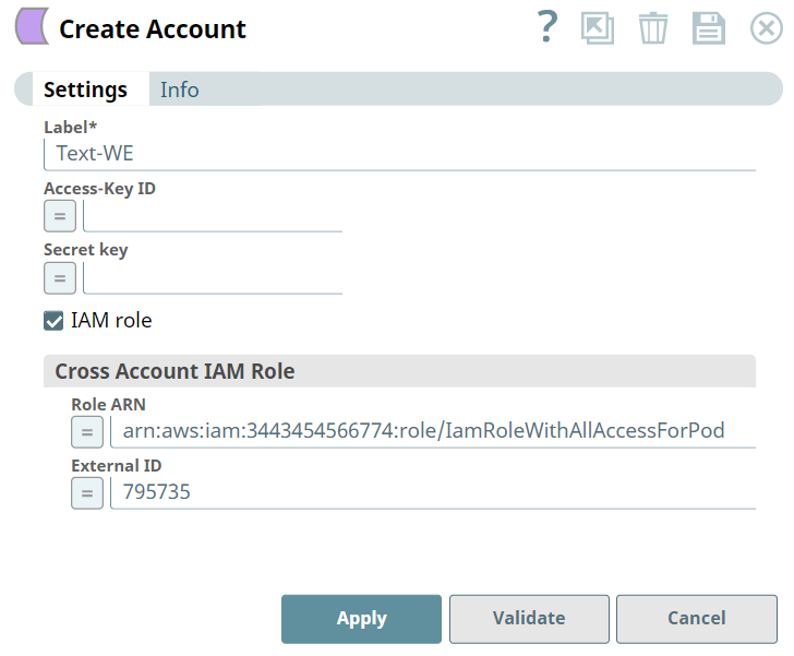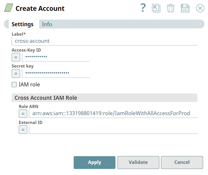 - For an account used in EC2 groundplex with IAM role configured, select the IAM role check box.