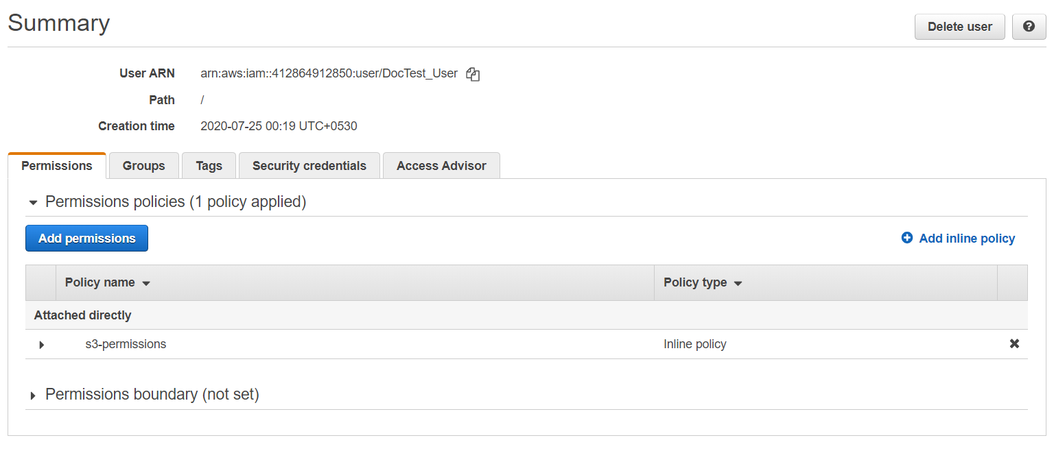 - In the Summary screen, click Add inline policy to attach the