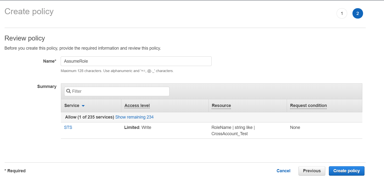 { "Version": "2012-10-17", "Statement": [ { "Effect": "Allow", "Action": "sts:AssumeRole", "Resource": "<Role ARN>" } ] } - Review the policy summary. Add a name and optionally, a description for this policy, and