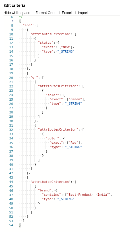 Select between the AND and OR operators to apply between the different criterion blocks - attributes, properties, keywords, or relationships that you would select for the search. Default value: OR Example: AND Note: This logical operator is applied at a criterion block level, where each block