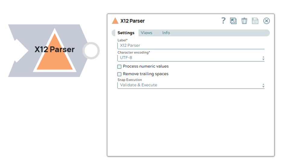 Use this Snap to parse X12 binary data into a JSON document. The Snap parses and validates the data against the schema of the expected X12 type (for example, 820-5010 or 270-5010), ensuring the data is valid and conforms to the specified X12 structure.