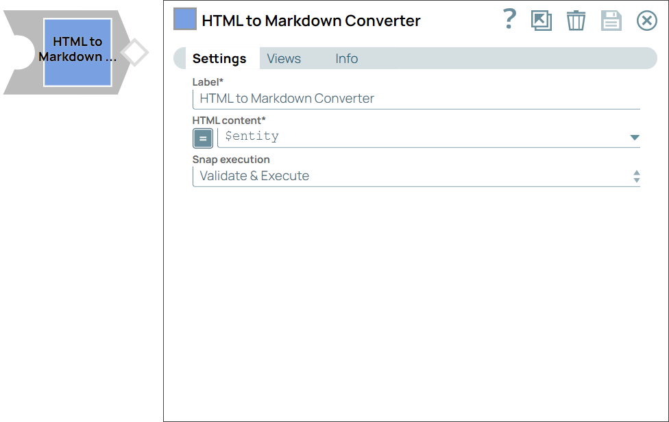 Required. Specify a unique name for the Snap. Modify this to be more appropriate, especially if more than one of the same Snaps is in the pipeline. Default value: Markdown Parser Example: Parse Markdown to Text |