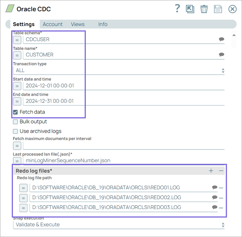 Configure the Oracle CDC Snap to extract transactional changes (Insert, Update, Delete) from the source table in the
