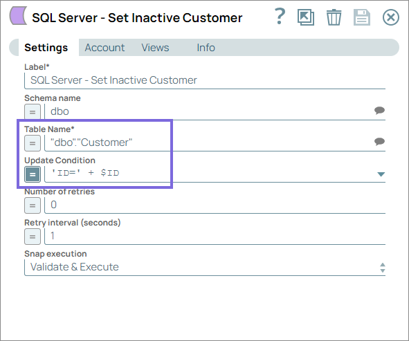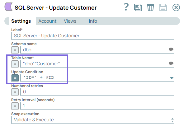 Configure the SQL Server - Update Snap to update