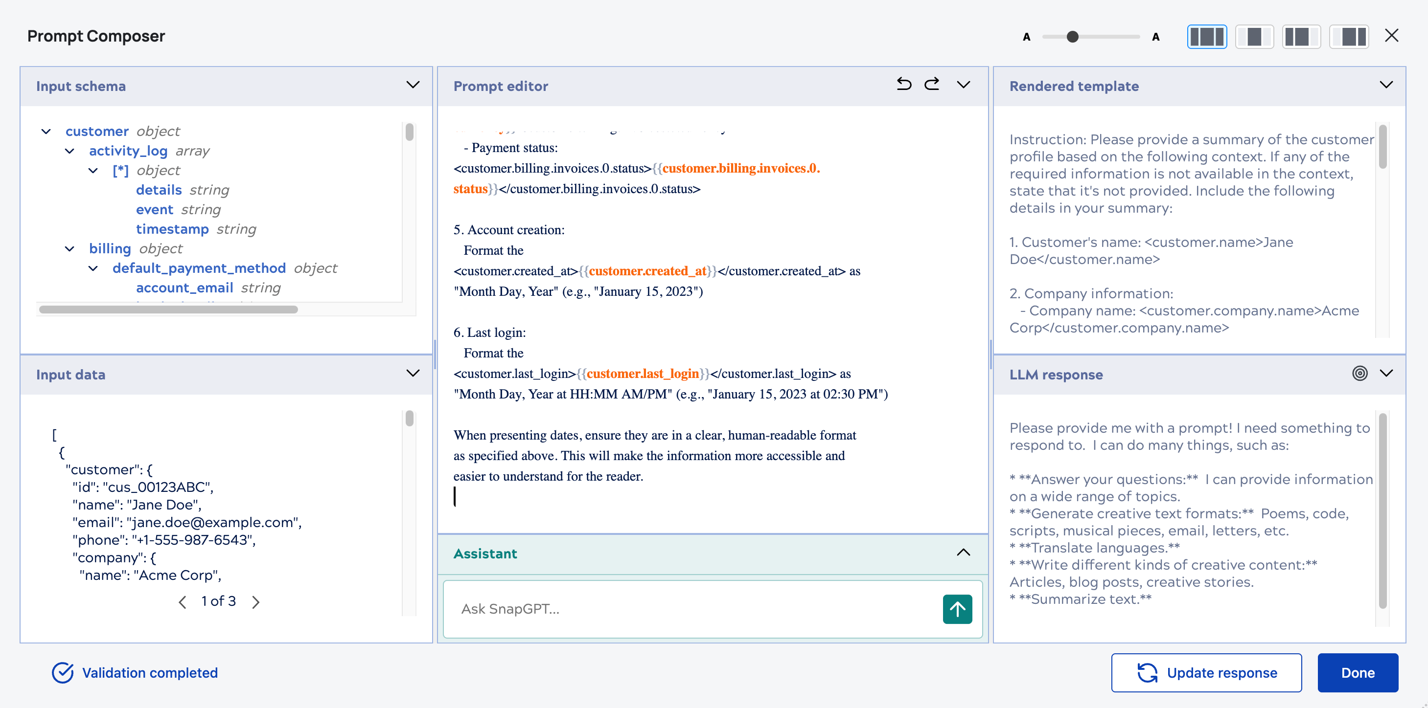 Prompt Composer is an interface that assists users in formulating well-structured prompts for AI models. It enables prompt engineering activities by providing a graphical console well suited to developing prompts through iteration. You can access Prompt Composer from inside four different Snaps. It has six panels, with three main sections for input, editing, and communication. Additionally, Prompt Composer uses SnapGPT assistance to help you rapidly iterate and improve your prompts.