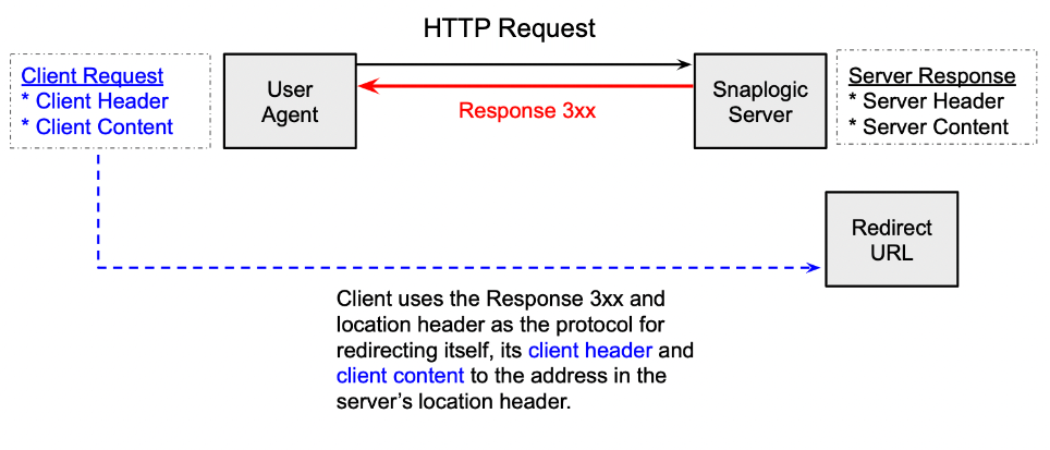 In this context, the client side is called the user-agent. For APIM, the user-agent might be a web browser, HTTP client, or cURL application. Since the user-agent is responsible for handling the response, the rule assumes that the user-agent (and not the server) performs the redirects; this includes processing follow-on HTTP methods, payload content, and redirect addresses. The server (Snaplex) is only responsible for setting the Response status type, status code, location header, and, where defined, the message content.