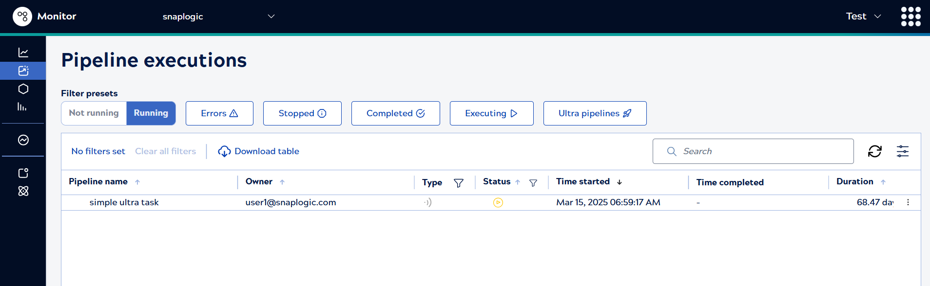 - Pipeline executions—Records of executed and executing pipelines, execution details include errors and logs. The default page when you open Monitor from the right side of the header is the Pipeline executions page.