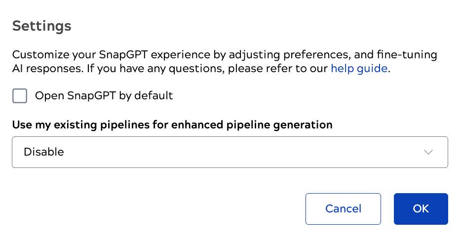SnapGPT automatically uses pipelines that have run successfully in the last few months for Retrieval Augmented Generation (RAG) to improve the quality of generated pipelines. |