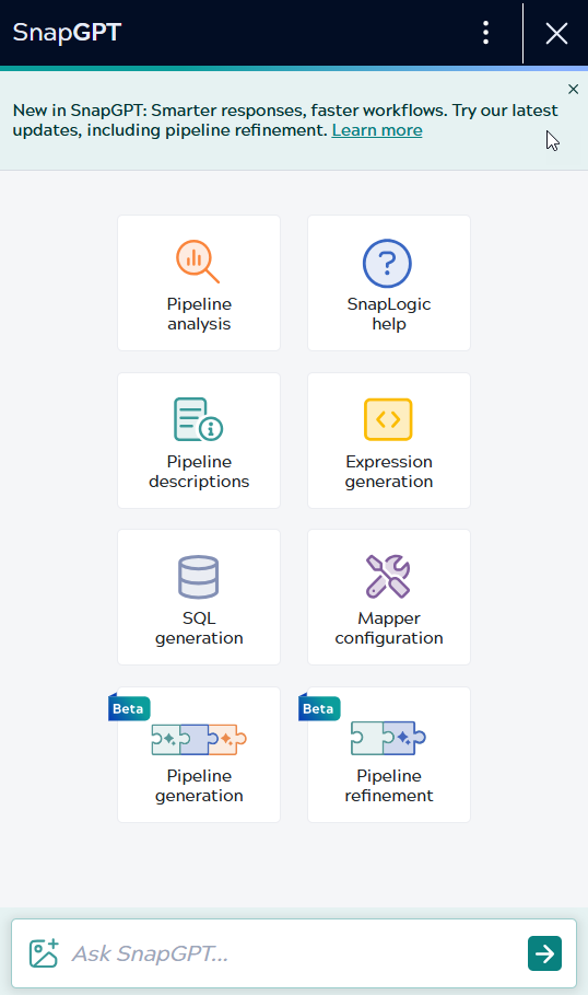 - Pipeline generation Beta: Creates an example prompt that you can edit to generate a pipeline as per your requirement. SnapGPT might generate several pipelines for you to choose from.