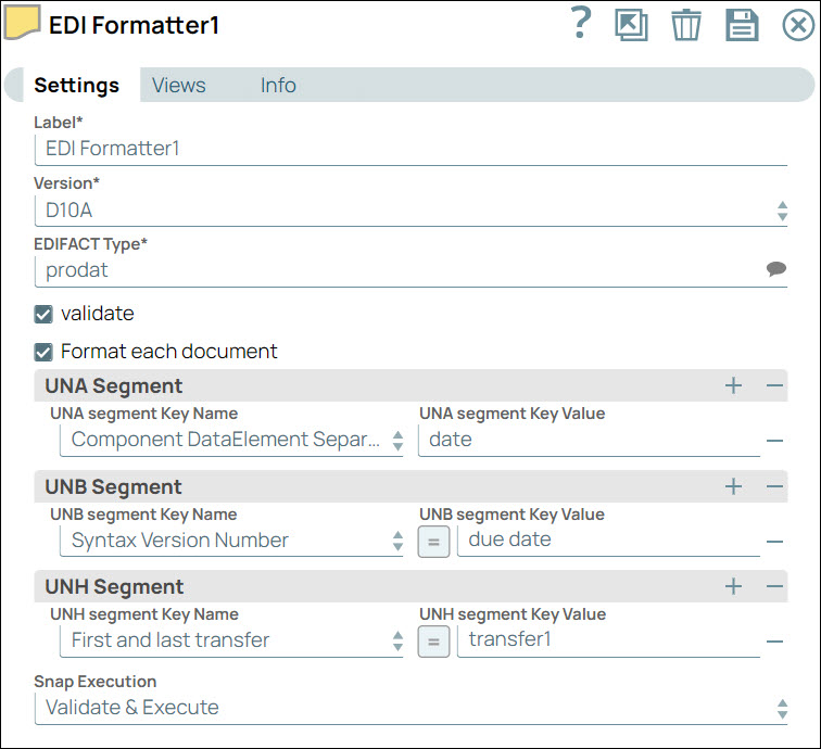 | EDIFACT Type | String/Expression | Specify the EDIFact types supported by this snap for the selected version.