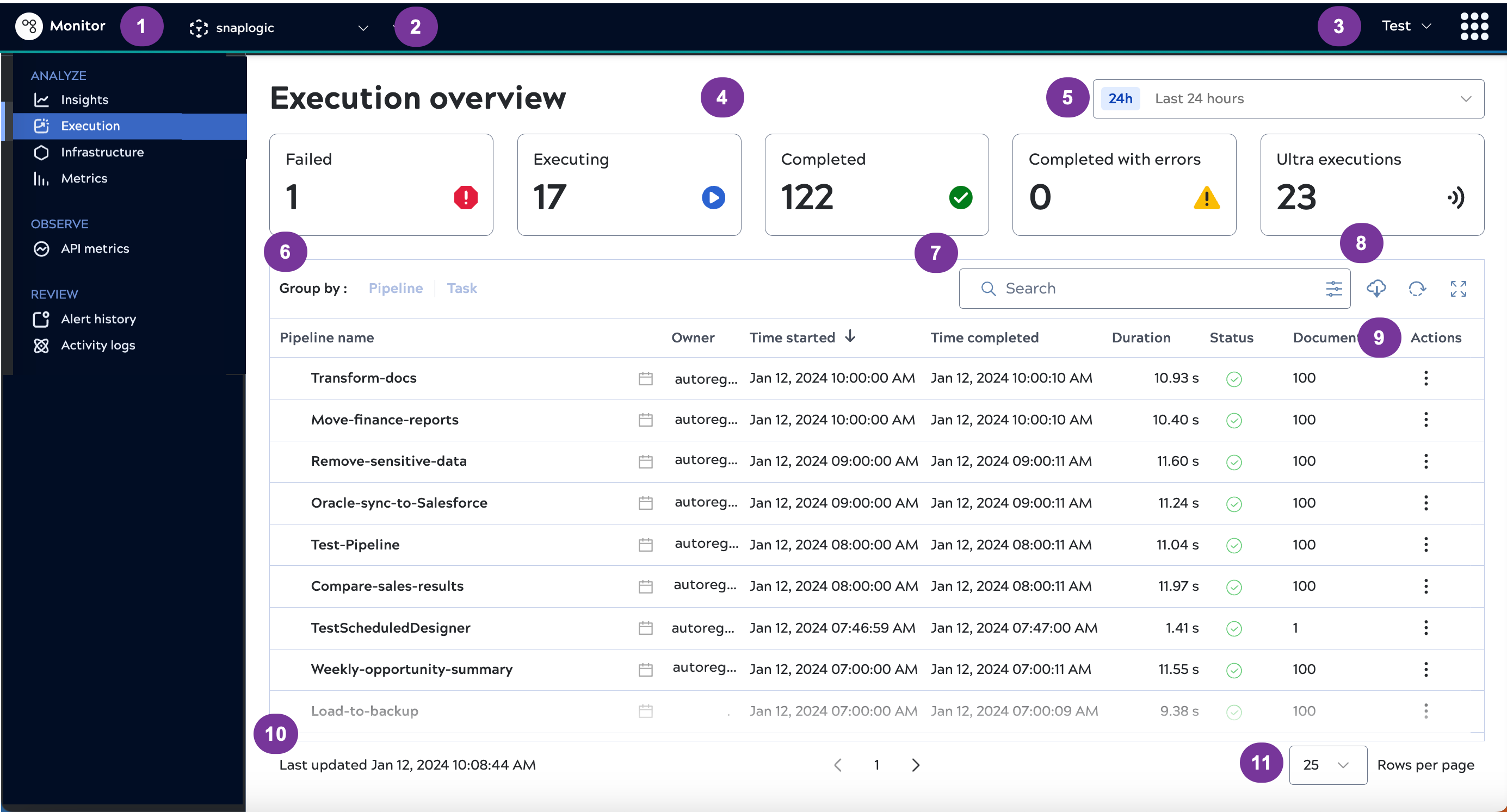 Group by: Aggregate executions by pipeline or by task. |