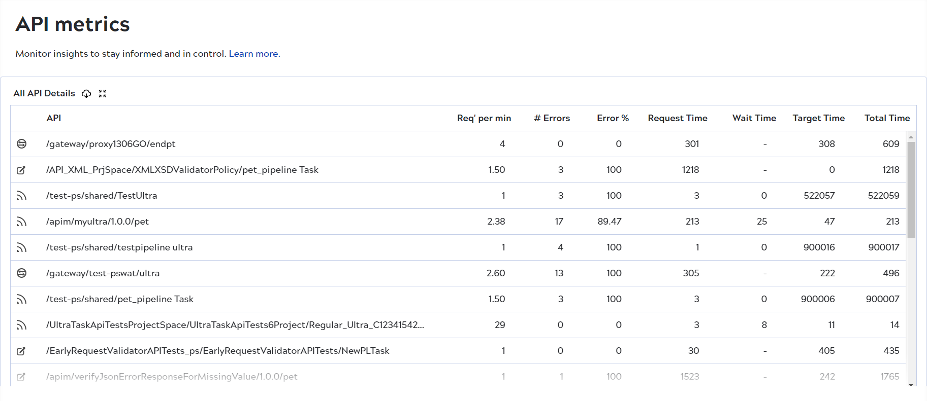 The API Metrics page separates response from target errors, making it easier to determine if the error occurred because of an API policy configuration or originated from the Pipeline runtime. Latency metrics facilitate fine-tuning the efficiency of your traffic control policies for your APIs. Furthermore, you can perform deep dive analysis from the page, and easily access the Pipeline runtime of a target API. This capability allows API developers to fix issues at the Pipeline level and improve the service that the API provides.