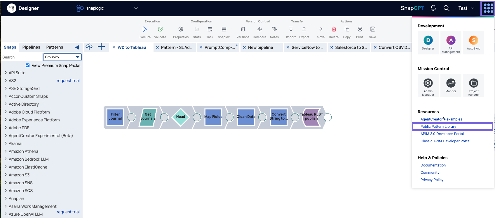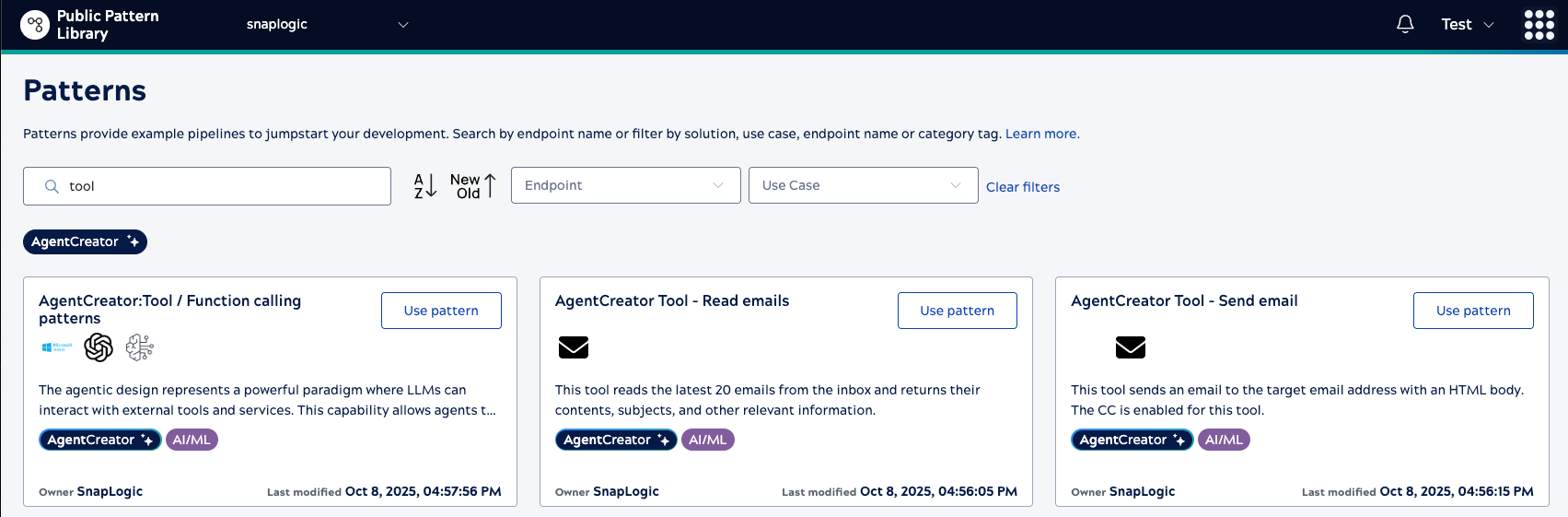 Tip: Enter tool in the Search field to narrow the results to only tool pipeline patterns.Alternatively, you can click any of the tools listed below. When you are logged into SnapLogic, clicking the link will redirect you to that pattern.- AgentCreator Tool - Read emails