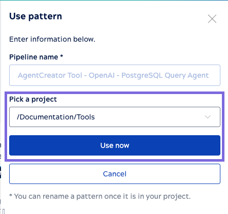 Click the AgentCreator pill button, then select a pattern that has the tool label.