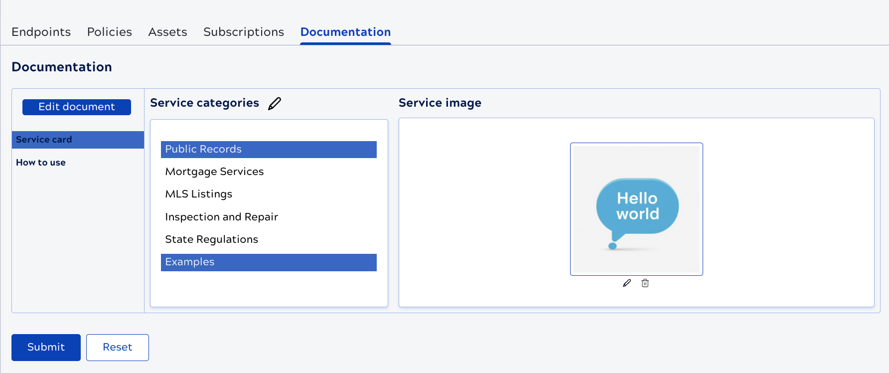Good documentation increases the probability that consumers use a Service correctly. The OpenAPI spec provides useful information, such as HTTP method types and expected request and response formats. In Service documentation, you can provide images and other details, such as the type of authorization required. This information displays to consumers when they click on the Service in the APIM 3.0 Developer Portal site to view its details. Organizing Services under categories and with tags makes it easier for consumers to find the appropriate Services.