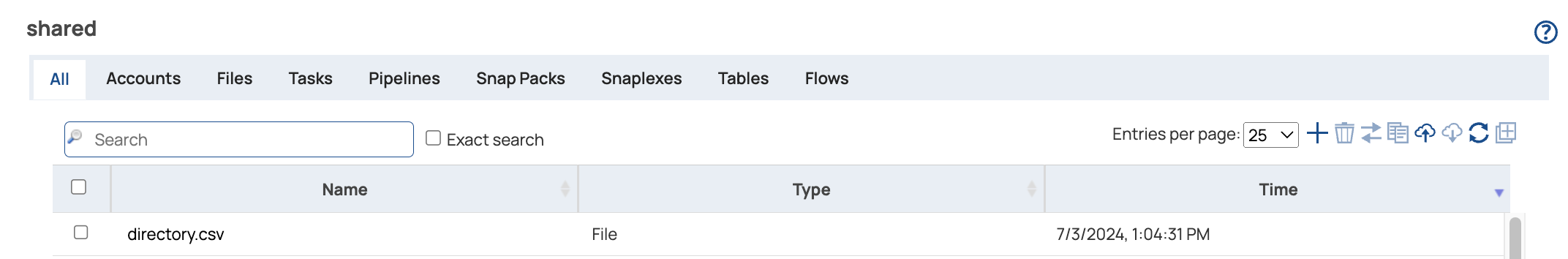 shared. The shared folder holds assets that any user in the environment can access such as endpoint account configurations, files, and pipelines. The assets display in a tabbed table in the main pane: