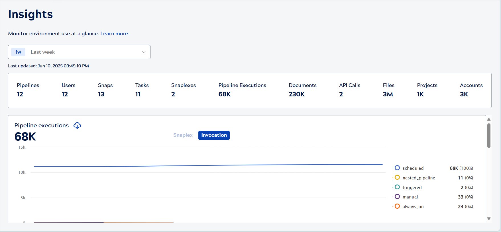 The Insights page shows an overview of environment use. Data collates daily at midnight UTC and the page refreshes when the data is ready. For example, data from Monday isn't added until a few hours after midnight on Tuesday.