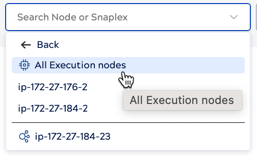 Click Metrics in the Monitor navigation menu and select a Snaplex node, or for a Snaplex with multiple execution or FeedMaster nodes, all execution nodes, or all Feedmaster nodes. The following example shows the dropdown menu for a Snaplex with multiple execution nodes:
