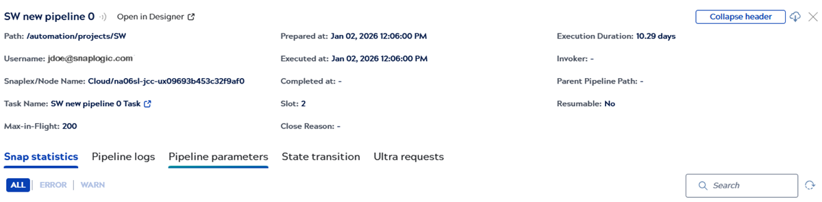 After locating the problem pipeline in the Pipeline executions table, identify which Snap or Snaps encountered an issue. Click the pipeline to open the details pane. From the details pane, try the following to learn more about the error: