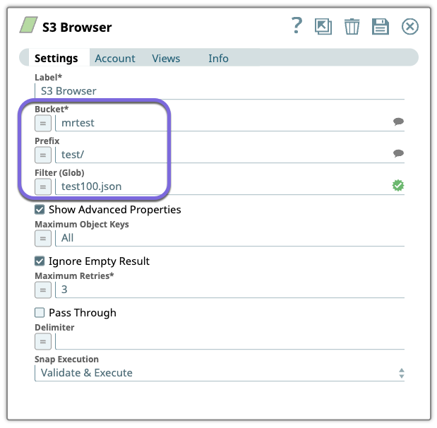 1. Configure the S3 Browser Snap to browse the test/test100.json object from the mrtest bucket.