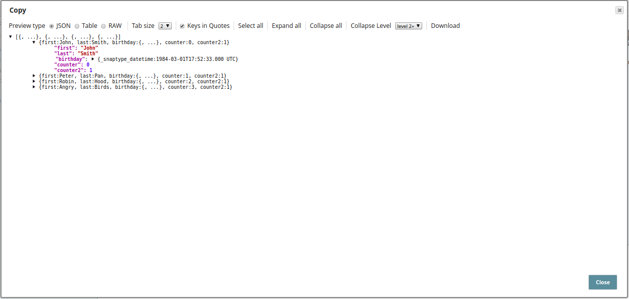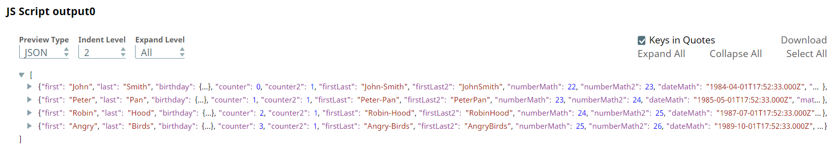 The following pipeline demonstrates how the Script Snap executes in all three supported languages. This pipeline uses a simple JSON file with First Name, Last Name, and Birthday.