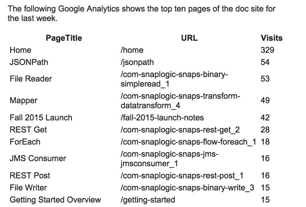 This query runs against this documentation site for a specific week returned the following results: