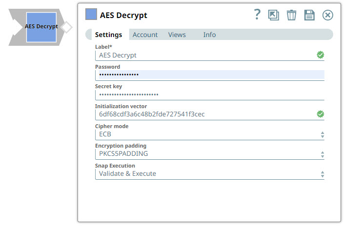 | Label | String | Required. Specify a unique name for the Snap. Modify this to be more appropriate, especially if more than one of the same Snaps is in the pipeline. Default value: AES Decrypt Example: AES Decrypt |