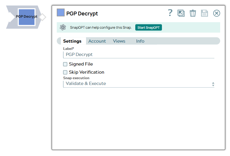 | Label | String | Required. Specify a unique name for the Snap. Modify this to be more appropriate, especially if more than one of the same Snaps is in the pipeline. Default value: PGP Decrypt Example: PGP Decrypt |