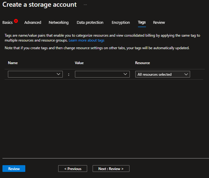- You can specify Resource Manager tags in the Tags tab to help organize your Azure