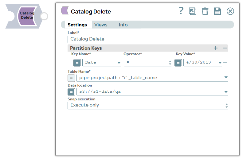 | Label | String | Required. Specify a unique name for the Snap. Modify this to be more appropriate, especially if more than one of the same Snaps is in the pipeline. Default value: Catalog Delete Example: Catalog Delete |