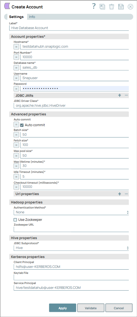 You can use this account type to connect Hive Snaps with data sources that use the Hive Database Account.
