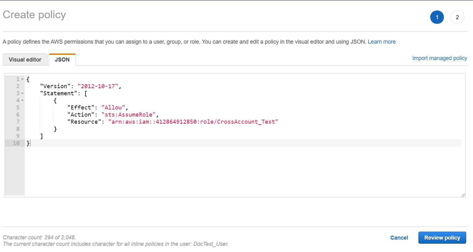 - Click the JSON tab and enter the following policy in the editor, and then click